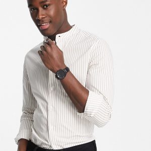 Chemise ajustée à rayures et col grand-père – Blanc et beige neutre – Homme grand