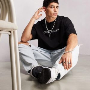 T-shirt oversize en jersey épais avec étiquette au niveau du col et logo brodé noir – Homme grand