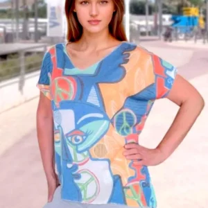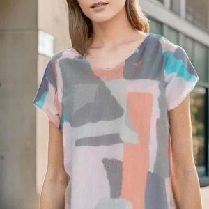 Tee-Shirt col V Femme Imprimé Abstrait Bleu, Orange et Corail