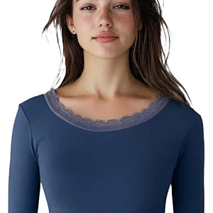Tee-shirt femme bleu indigo dos et col en dentelle