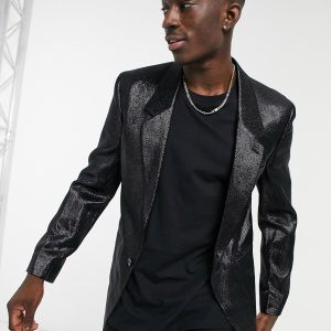 Blazer long ajusté à effet mouillé noir – Homme grand