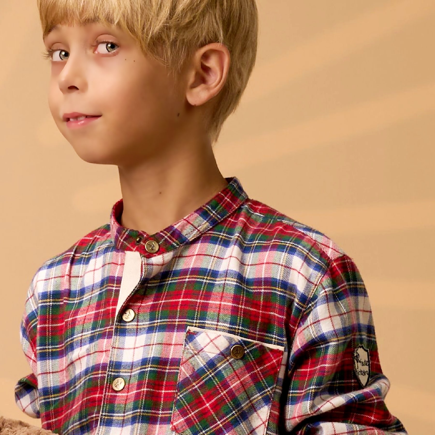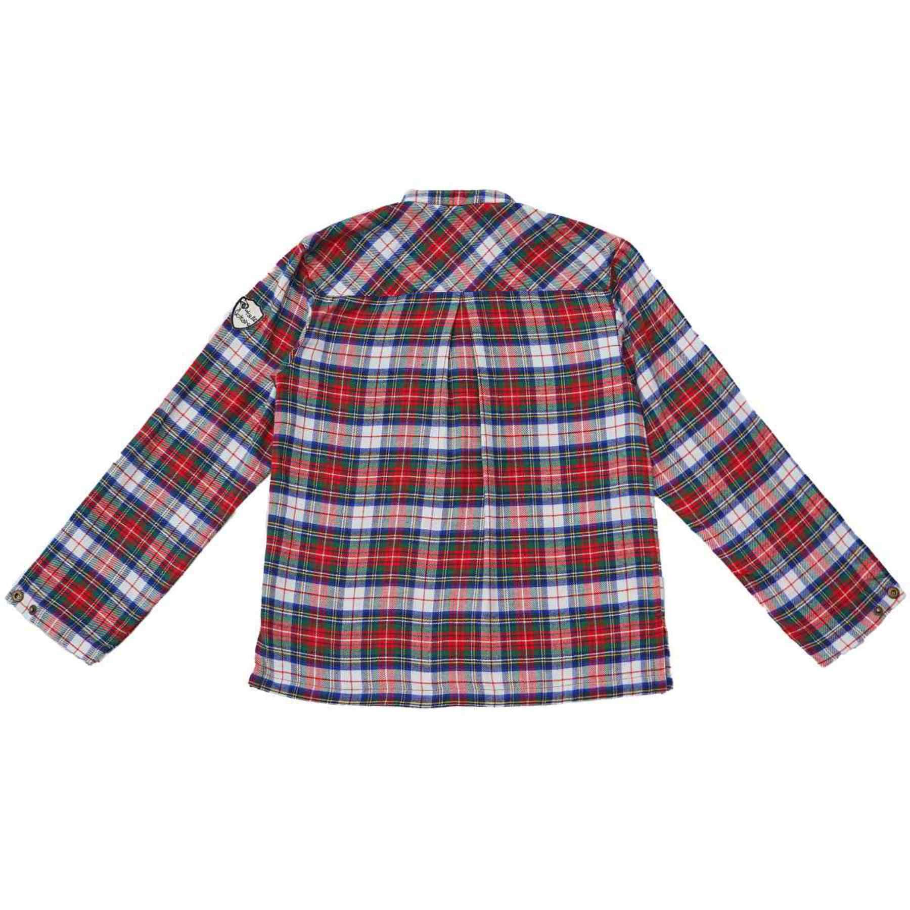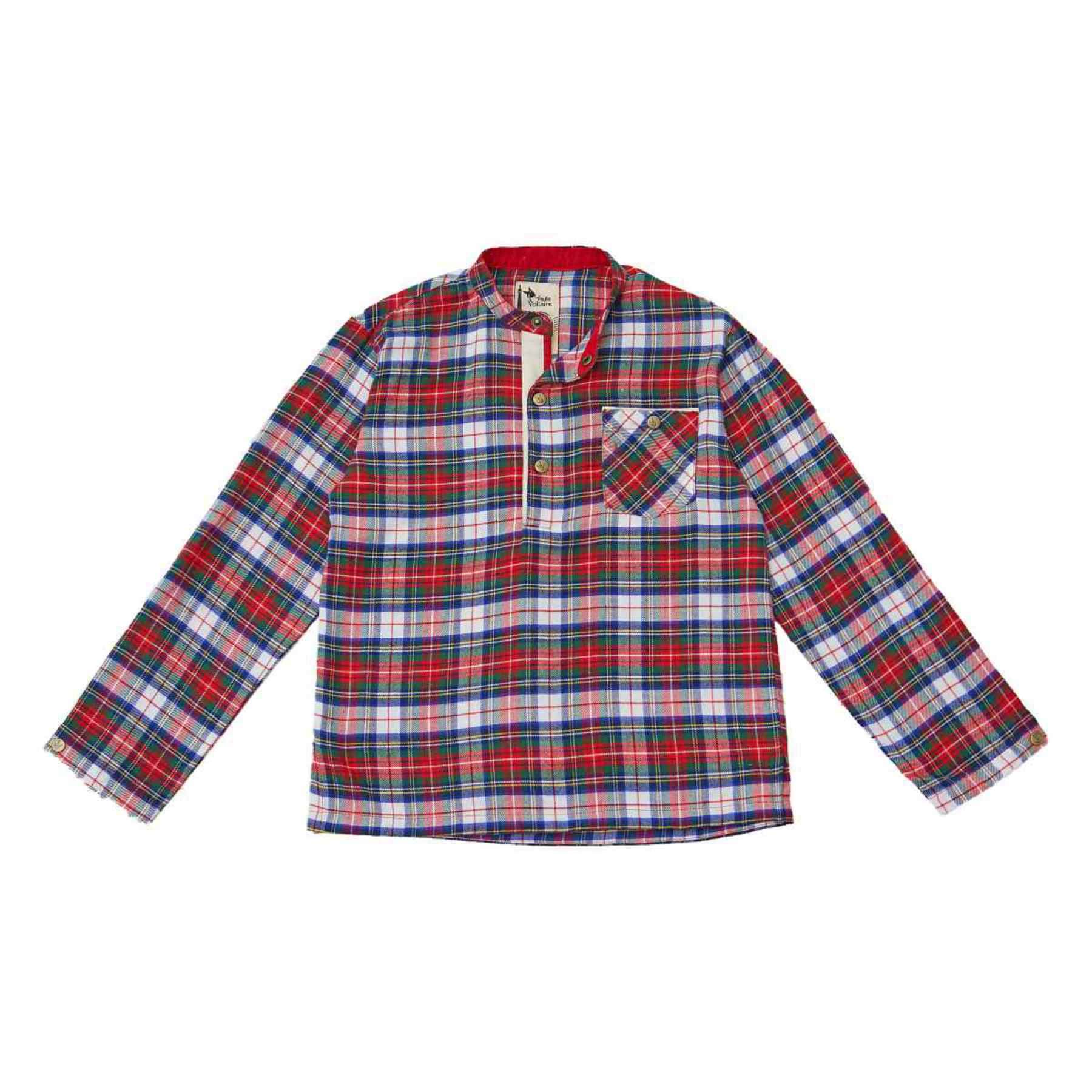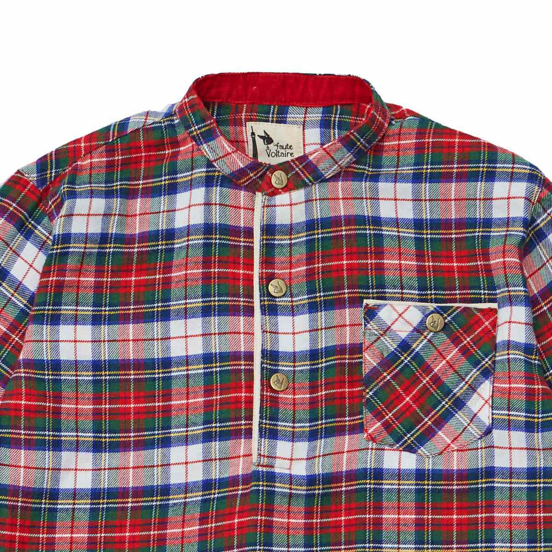 La Faute à Voltaire présente pour les fêtes de Noël des garçons de 2 à 16 ans une élégante chemise à manches longues et col Mao en flanelle à carreaux tartan rouge-blanc-vert | RIMBAUD.