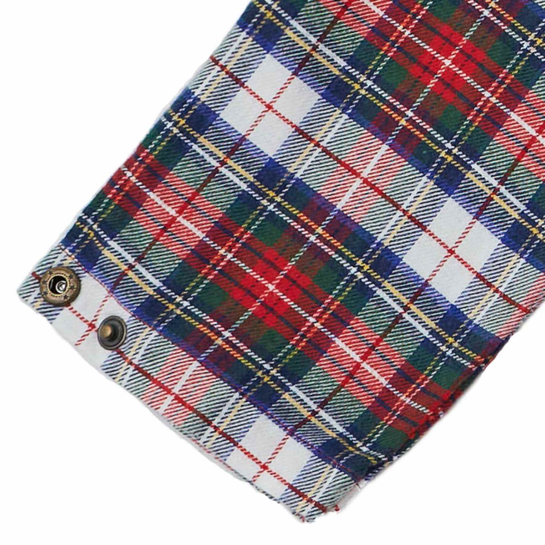 La chemise Rimbaud à carreaux tartan rouge-vert-bleu- blanc est parfaitement assortie à la robe de Noël rouge “Hepburn” au col Claudine au tissu tartan rouge et blanc.