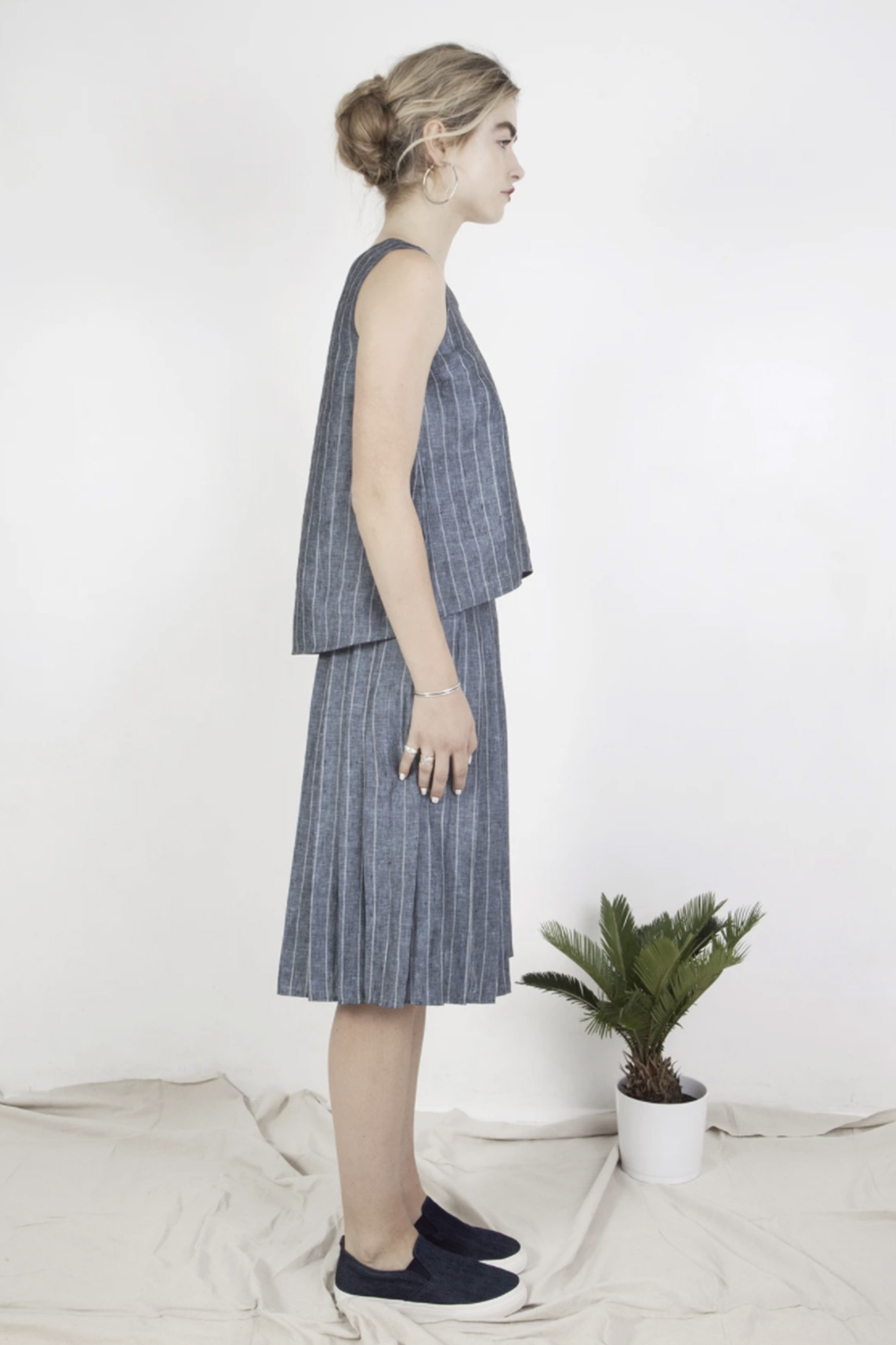 Crop top en lin, col V devant et derrière, plus long derrière. Rayures tennis sur fond bleu-gris.