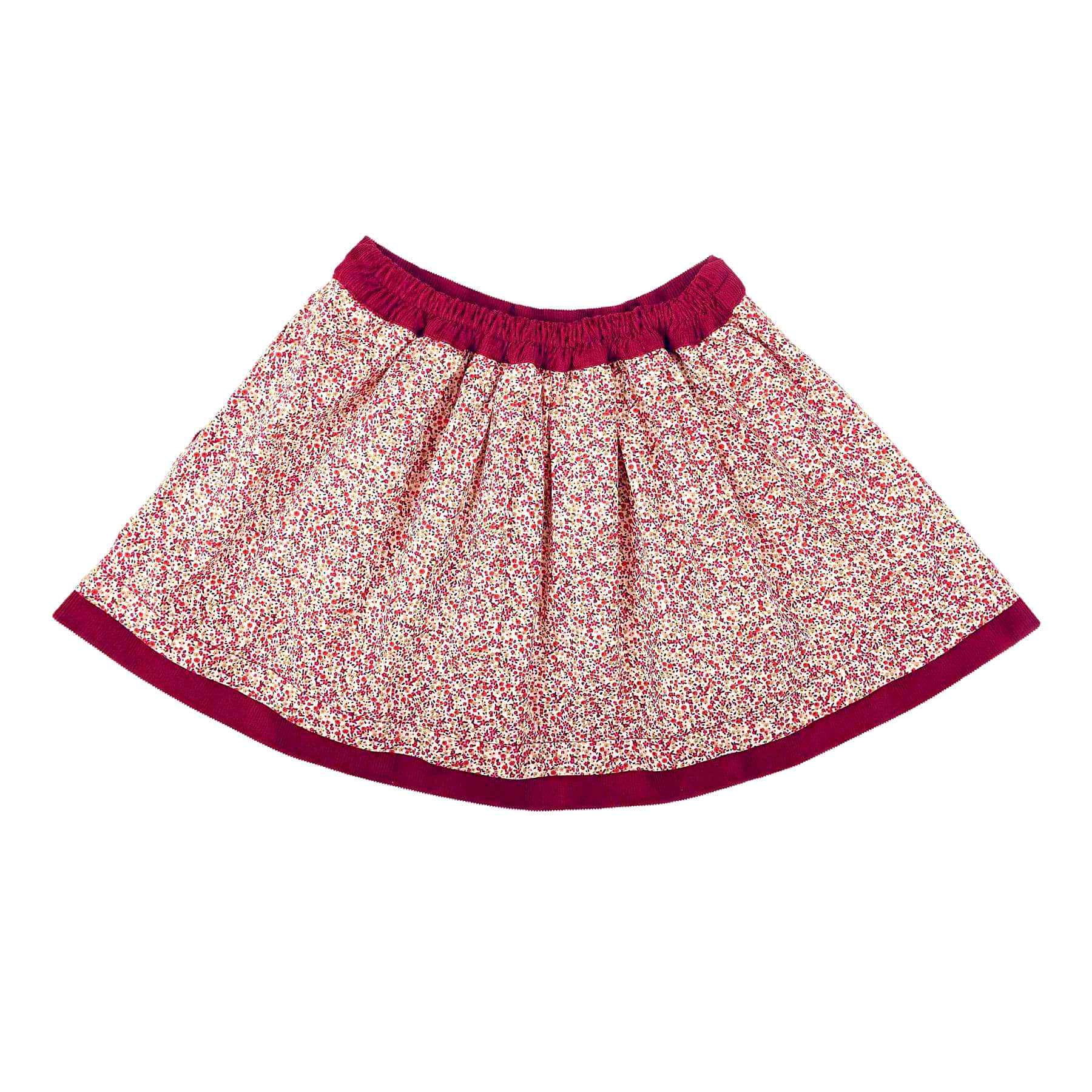 La Faute à Voltaire, présente cet hiver pour les petites filles de 2 à 11 ans, une jolie jupe en coton liberty fleuri rouge/blanc et à la taille élastique en velours bordeaux | LILOU.