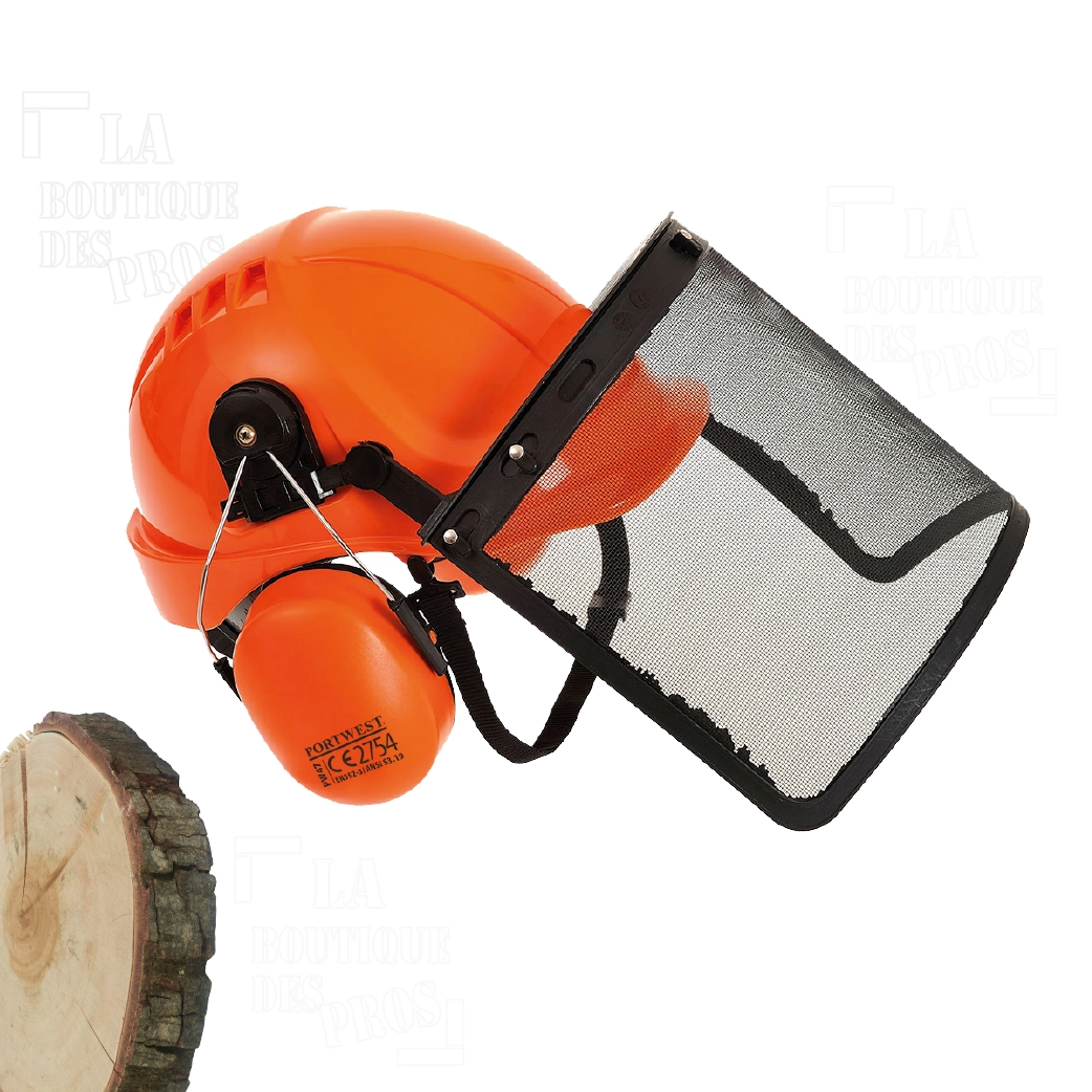 Kit forestier professionnel contenant un casque de sécurité en ABS ventilé avec roue à cliquet, deux coquilles antibruit haute performance en ABS, et une visière en maille (PS58).