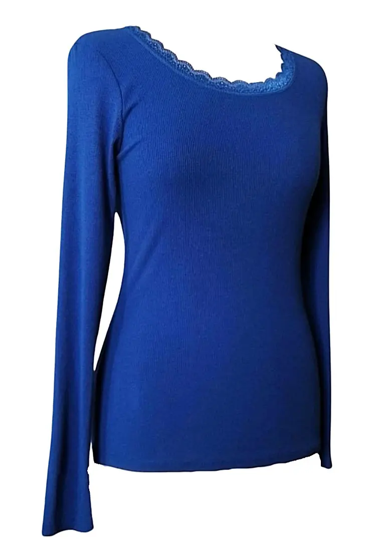 Tee-shirt col et dos en dentelle couleur bleu dur et manches longues