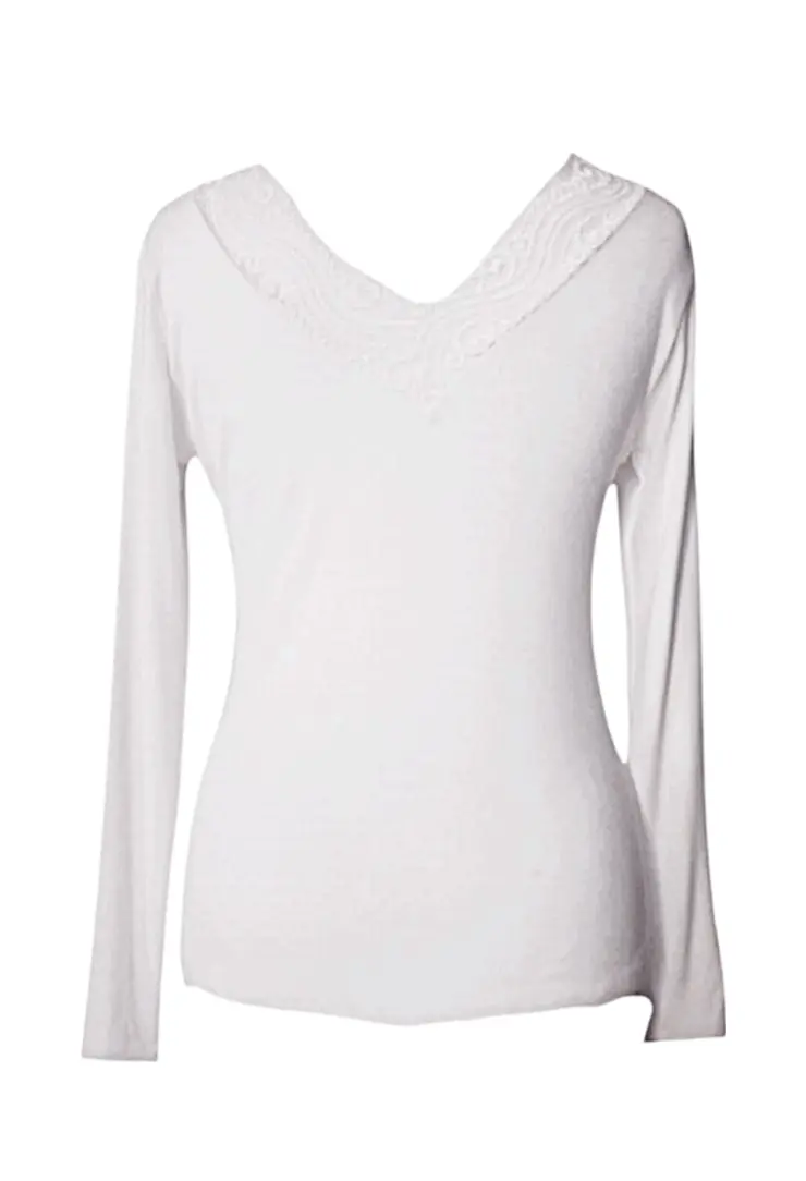Tags : tee-shirt femme, blanc, manches longues, décolleté V, dentelle, viscose, élasthanne, confort, élégant, ajusté.Ajoutez ce tee-shirt à votre collection pour un choix intemporel Commandez maintenant pour bénéficier de la livraison gratuite !