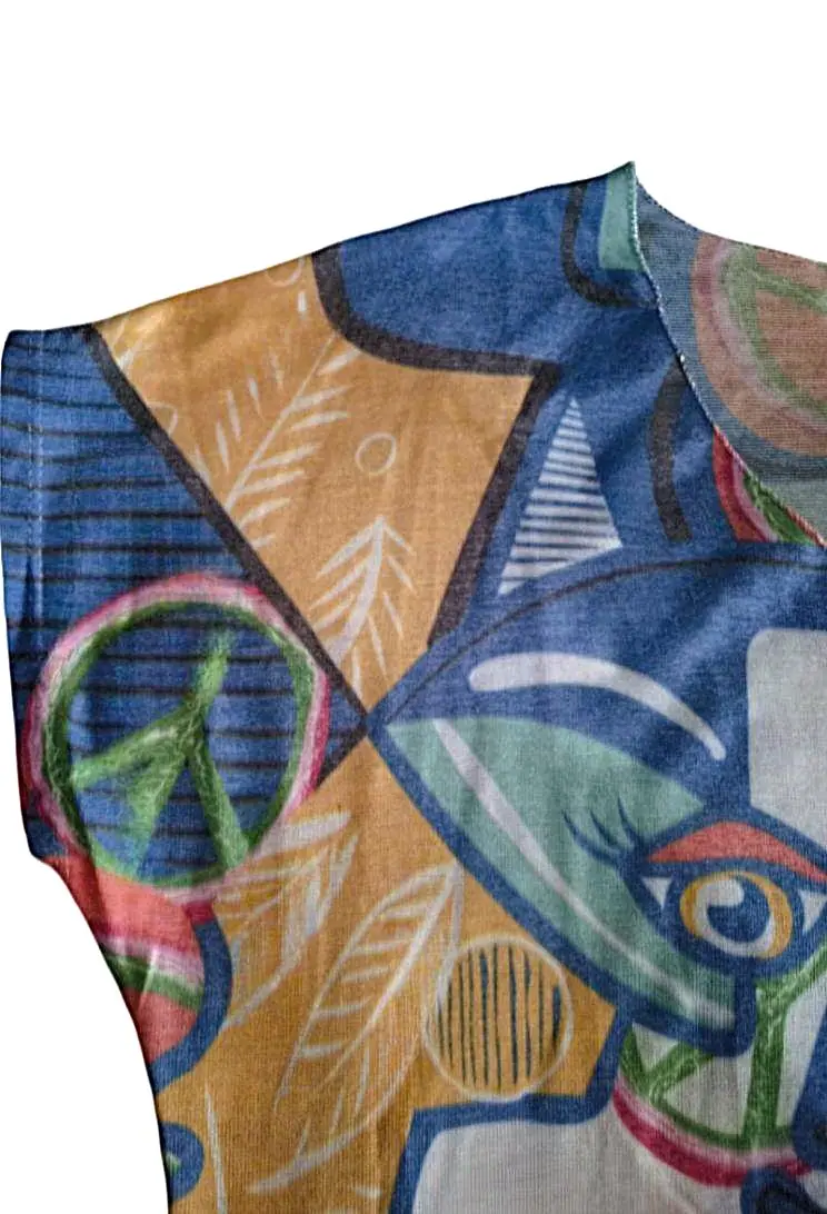 Plongez dans l’audace avec notre tee-shirt abstrait aux teintes éclatantes de bleu dur, orange et corail, confectionné en polyester et viscose pour un toucher doux et une légèreté comparable au coton. Ce modèle, fidèle à cette coupe iconique présente dans notre boutique, se distingue par son design artistique et vibrant, parfait pour rehausser vos tenues quotidiennes ou sorties stylées. Son col en V festonné avec fil argenté et ses manches courtes sans emmanchures ajoutent une note sophistiquée.